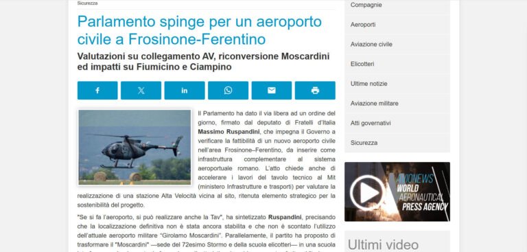 Un nuovo aeroporto a Frosinone è previsto nel Piano Nazionale Aeroporti, che mira a rinnovare e ampliare le infrastrutture aeree in Italia. Il progetto per l’aeroporto di Frosinone è in fase di sviluppo, con studi di fattibilità già completati56. Tuttavia, non ci sono dettagli specifici sulla tempistica della costruzione o sull’inizio dei lavori. Il piano generale include anche l’espansione dell’aeroporto di Fiumicino, per gestire un aumento significativo del traffico passeggeri previsto nei prossimi anni