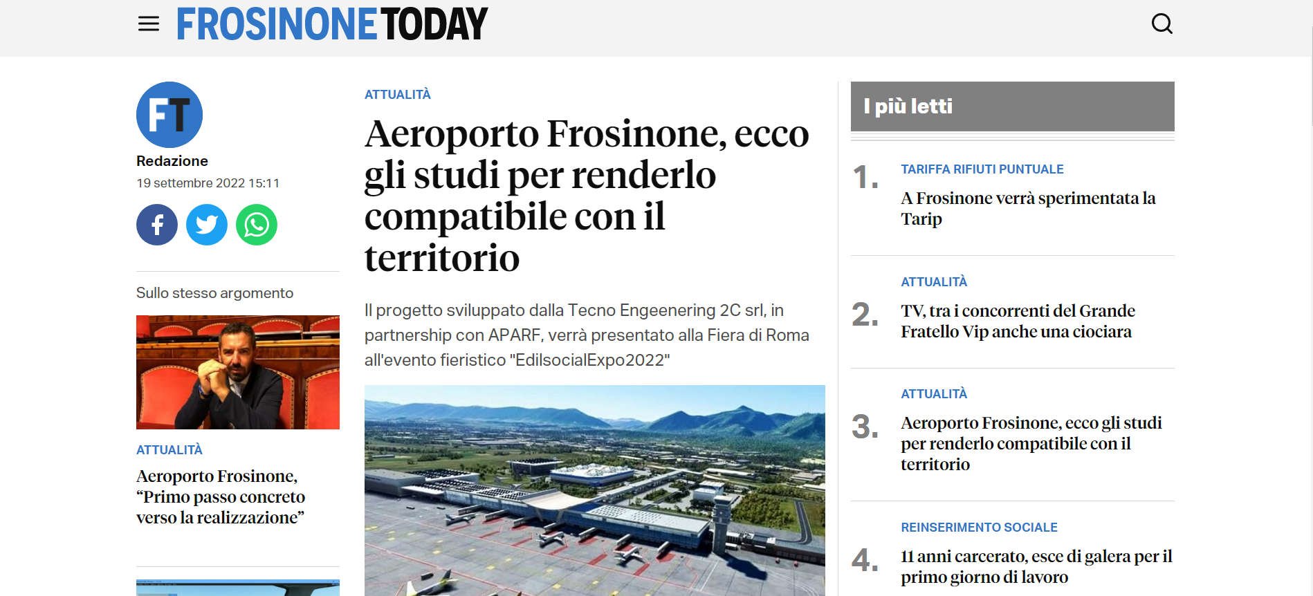 Il progetto dell’aeroporto civile di Frosinone continua a viaggiare a gonfie vele. Dopo l’inserimento da parte dell’Enac nel piano straordinario dei nuovi aeroporti italiano che il presidente di Palma presenterà al Ministro dei trasporti, si inizierà a vedere come sarà la nuova struttura sarà integrata nel territorio grazie alla presentazione nei prossimi giorni all’evento EdilsocialExpo2022 dei vari studi sulla volatilità e compatibilità aeronautica.